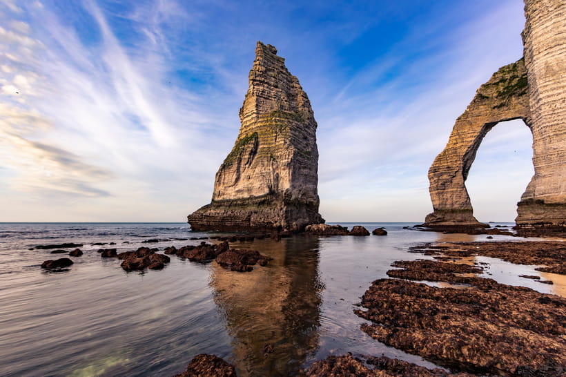 En Normandie, à quelques dizaines de kilomètres du Mont-Saint-Michel, venez admirer cette œuvre architecturale de la nature. À Étretat, vous découvrirez un cadre idyllique pour un séjour en couple ou en famille. On ne manquera pas de voir les incontournables portes d'Étretat : la porte d'Aval (la plus célèbre), la porte d'Amont (la plus petite) et la Manneporte (la plus grande).Depuis la porte d'Aval,vous pourrez notamment voir la Chambre des demoiselles tandis qu'au sommet de la falaise d'Amont, on découvre la chapelle Notre-Dame-de-la-Garde. Depuis la plage, uniquement à marée basse, les curieux s'aventureront en direction de la grotte du Trou à l'Homme.Armez-vous de bonnes chaussures, et laissez-nous vous guider.